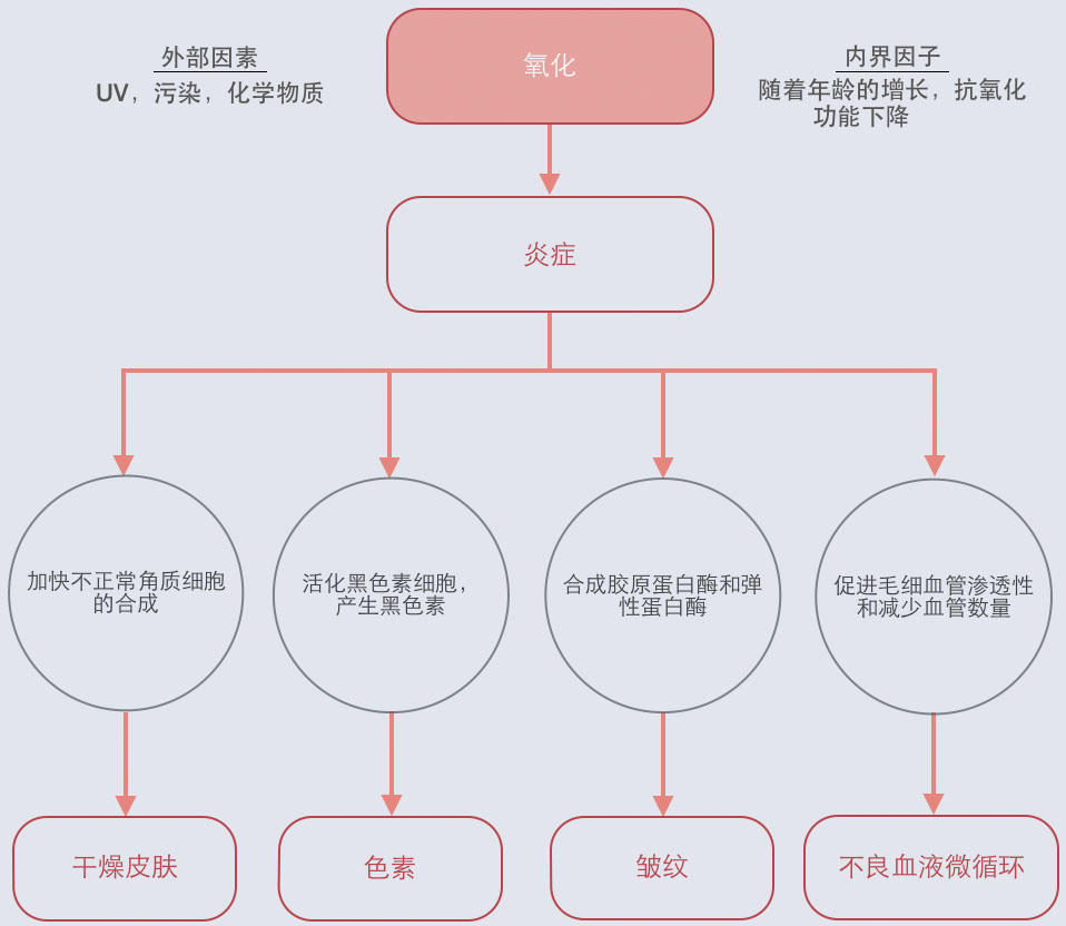 人体暴露于外界侵袭下会产生过量自由基,随着年龄的增长,细胞会失去对抗此自由基的能力。慢慢地,这些自由基带来的氧化压力损害变成永久性的,这时,细胞无法修复胶原蛋白和弹性蛋白,而是利用胶原蛋白酶和弹性蛋白酶将其破坏。