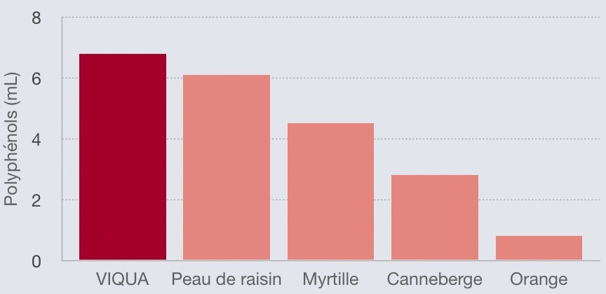 Toutefois, VIQUA® est particulièrement riche en un autre type de molécules anti-oxydantes – les polyphenols. VIQUA® contient plus de polyphenols que n’importe quel autre fruit de notre alimentation.